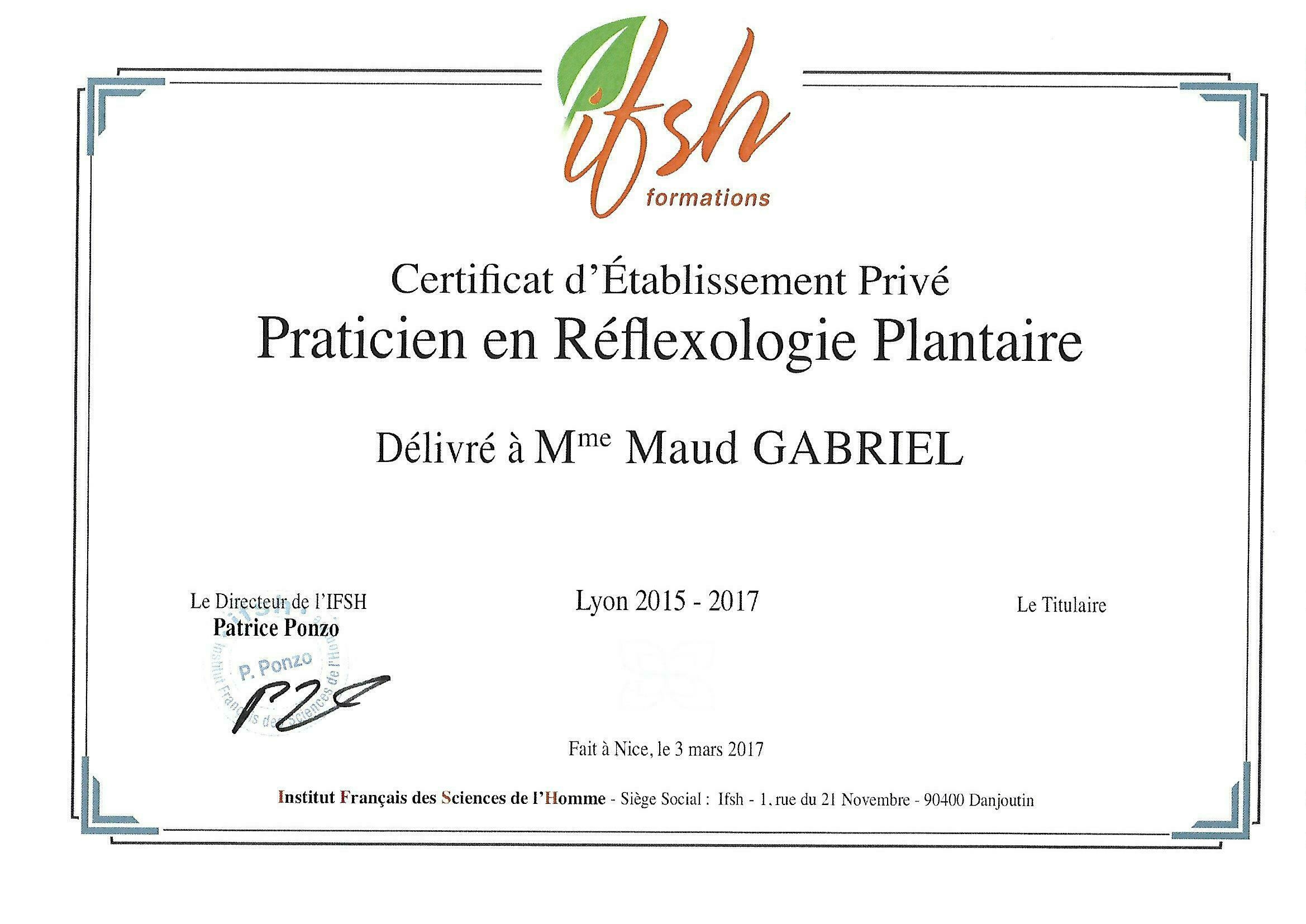 Certifiée en Réflexologie Plantaire par l'IFSH 2015 / 2017