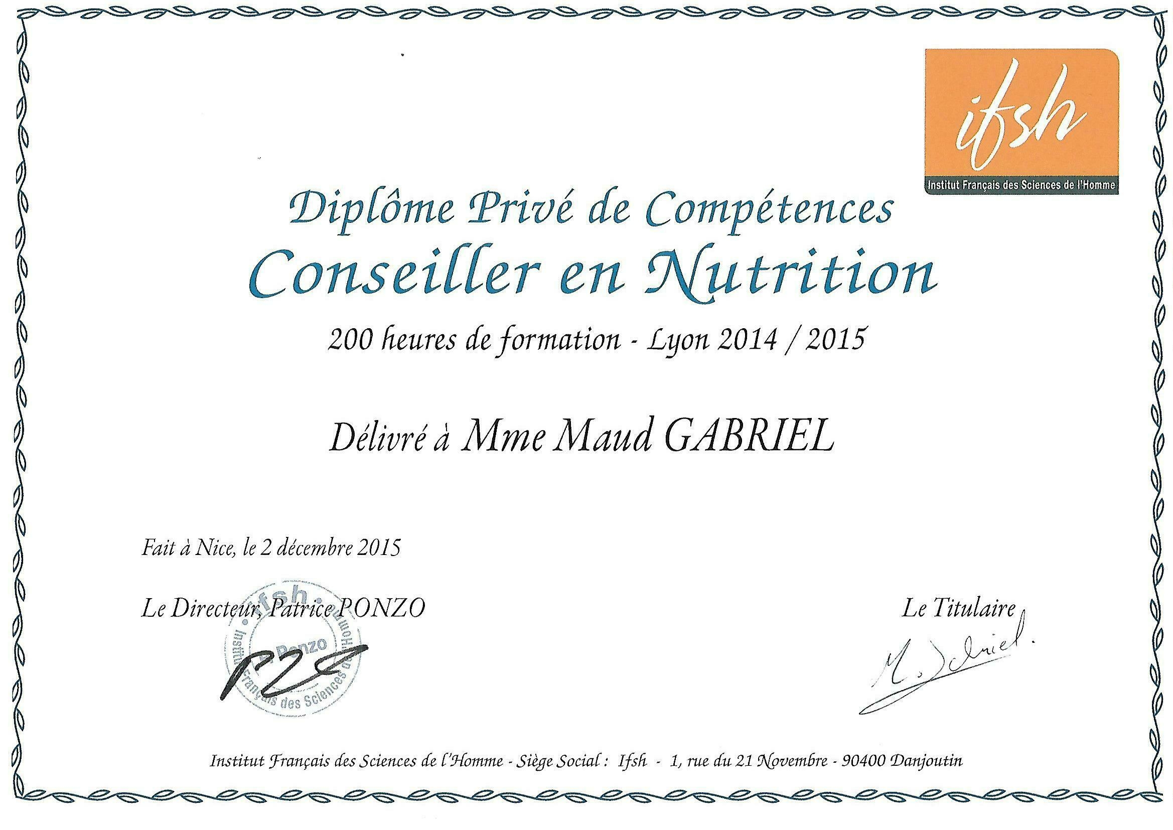 Diplôme de Conseillère en Nutrition délivré par l'IFSH (2014 / 2015)