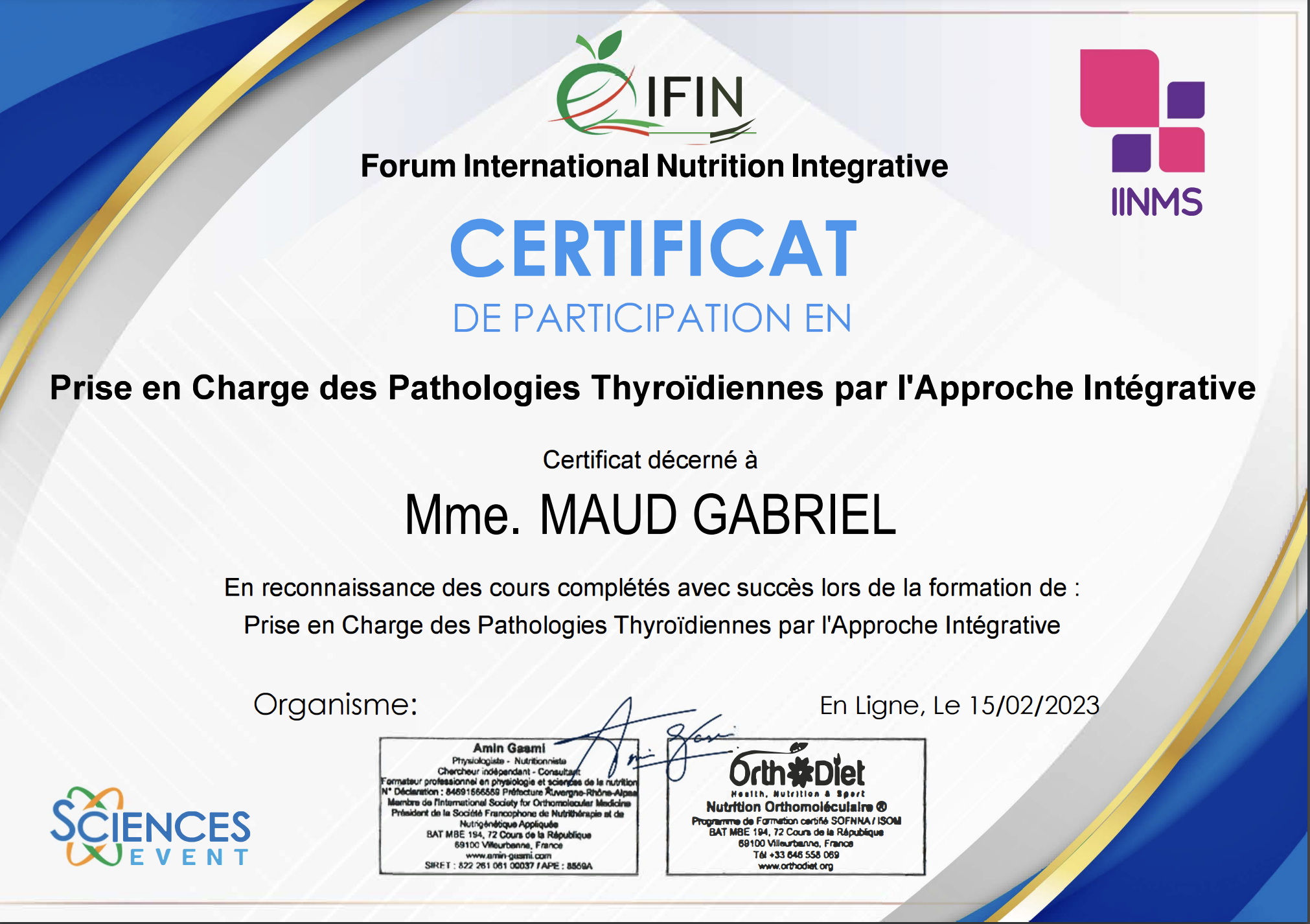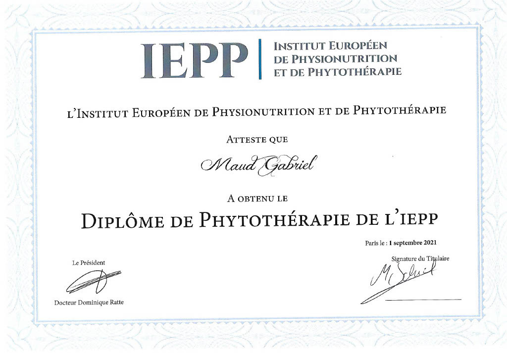 Diplôme de Physionutrition de l'Institut Européen de PHysionutrition et de Phytothérapie 2021